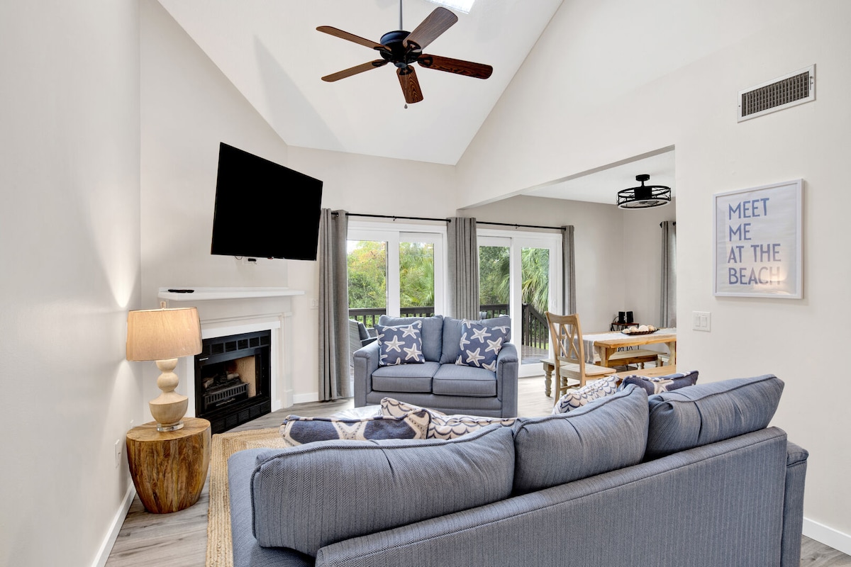 This clean, cozy, tranquil, hideaway nestled in a central location, with a short walk to the Gulf that includes private access. Bedrooms feature a king bed, queen bed, and full bed . Each of the bedrooms have a stunning marble style full bath attached. The living room includes a sofa bed and a roll out full bed for extra guests to sleep comfortably. Pool, pickle ball, tennis and basketball courts, as well as beautiful lakes (for fishing!). Shopping/Restaurants/Entertainment are steps away!