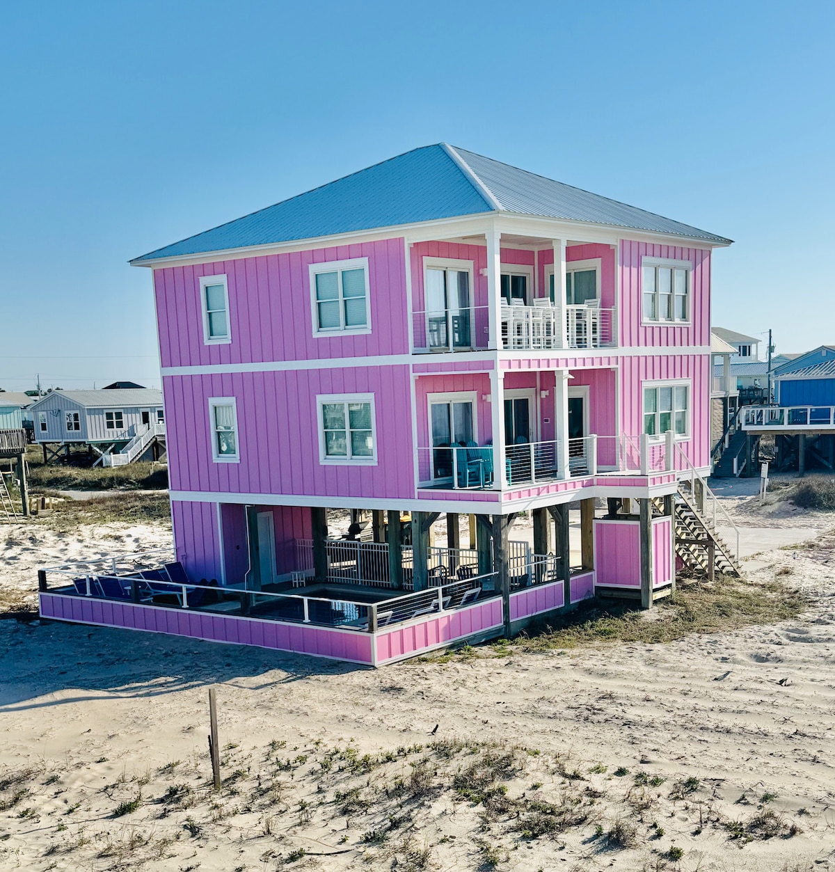 ✔ Directly Across From Beach ✔ All Dogs Welcome, Dog-Friendly Beach ✔ 4 Bedrooms, 2 Bathrooms – Sleeps Up to 10 ✔ Unobstructed Ocean Views from Wrap-Around Deck ✔ Full Putt Putt Course & Corn Hole Under the House ✔ Spacious Deck with Adirondack & Lounge Chairs + Outdoor Shower ✔ Beach Wagon, Chairs, Toys & Boogie Boards Provided ✔ 5 Minutes to Local Restaurants, 20 to Downtown Gulf Shores ✔ High Chair, Pack ’n Play, Linens, Towels & Soaps Included
