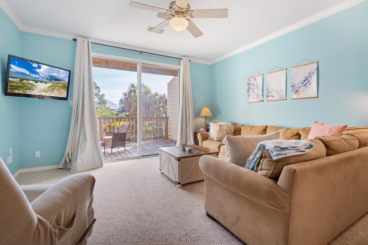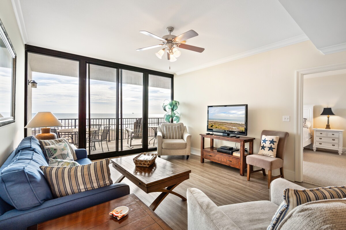 You will fall in love with our view, and our stylish and comfortable condo on the second floor overlooking the Gulf and beach! All you need to bring is clothes and food. We have all the kitchen essentials, linens, and beach chairs. You will have covered parking in our gated garage with access to the outside pool, inside pool, hot tub, gym, tennis courts, and outside grills. The boardwalk takes you right to the beach. We give you a parking pass that will let you drive to the beach too!