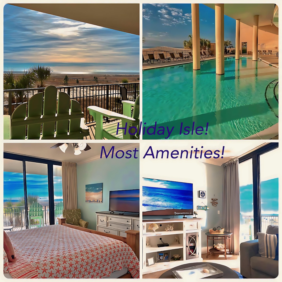 Holiday Isle is the premier resort style complex on Dauphin Island! This newly renovated third floor beachfront has all very nice furnishings and fully stocked for your stay ! Spacious balcony with upgraded patio furniture! Complex amenities include outdoor pool and indoor heated saltwater pool, hot tub, steam room, sauna, exercise room, grilling area, covered parking and more! Nearby activities include beach going, fishing, biking, birdwatching, golfing, sightseeing, fresh local seafood !