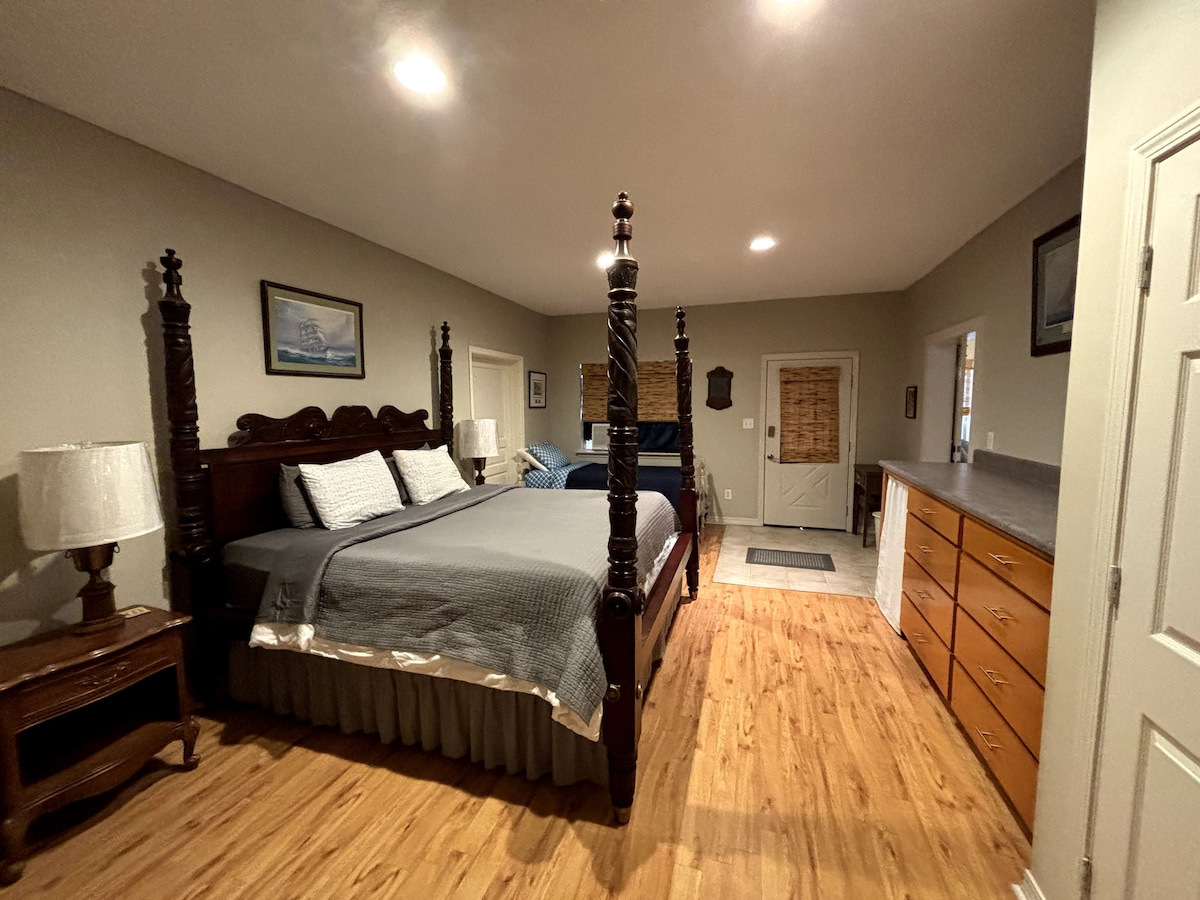 Welcome to Spyglass Farms! Be a guest in an apartment on horse farm with a king bed, full bed and twin bed with private bathroom, kitchen and living room. Guests are welcome to barbecue on the porch, feed horses and walk down to the lake to sit on the swing or fish. There is a shared laundry room if you need to wash clothes during your stay. We are happy to host you and your family for a weekend or for long term stays for weeks and months. Animal friendly with a $25 pet fee!