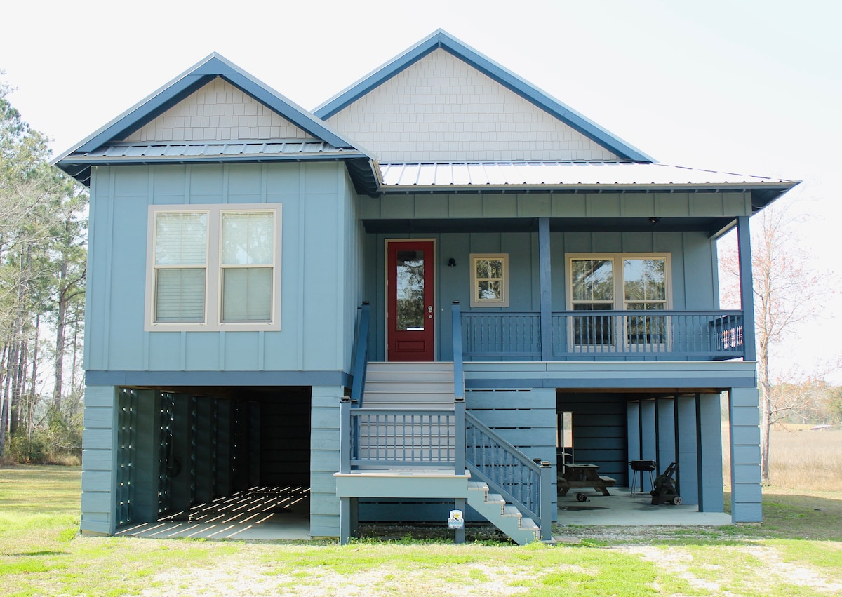 Forget your worries in this spacious & serene Cottage. Enjoy a book as you swing at the Koi Pond or relax at Main House Patio taking in the waterfront view on beautiful Fowl River. Owners live on property. Mariana 1/2 mile away. Kayaks on property to reserve. 20 min. drive to Dauphin Island. 10 minute drive Belingrath Gardens. Perfect for Snowbirds, fishing rodeo, quick getaway, or sewing retreat for small group. No pets. RVs, boats, trailers not allowed on site. No additional cleaning fee
