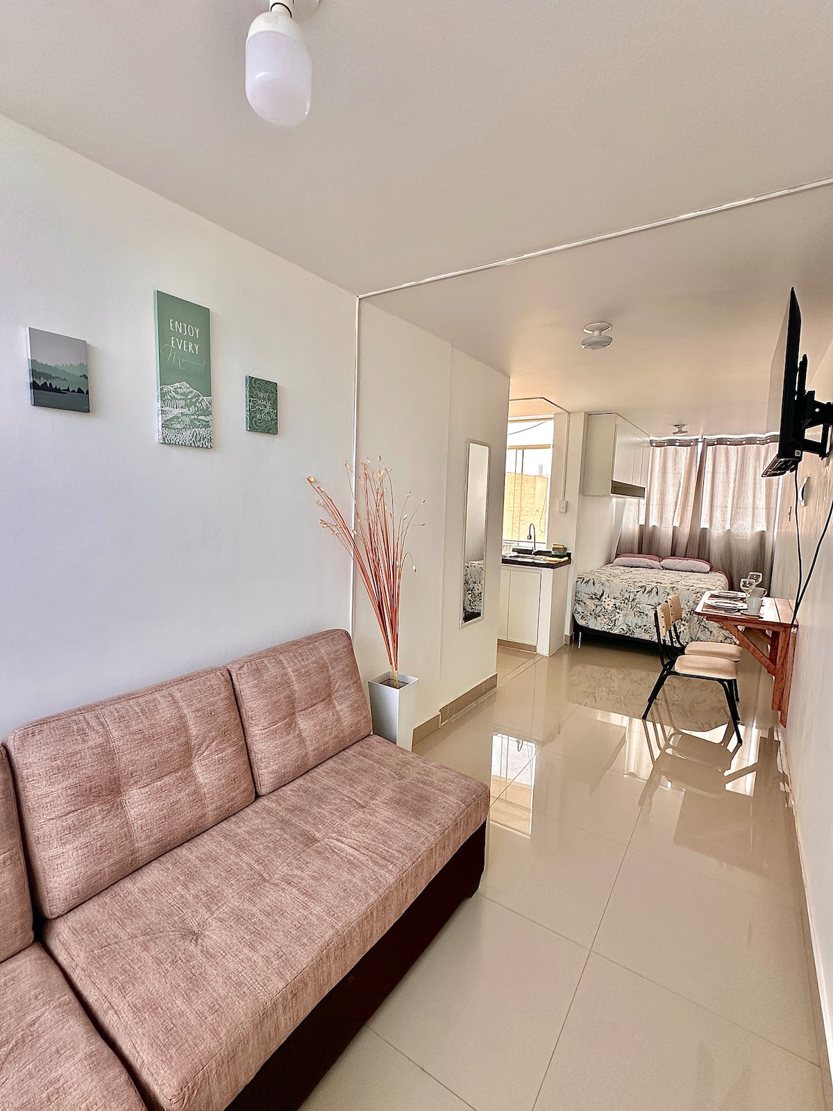 Mini departamento TIPO ESTUDIO AMOBLADO e INDEPENDIENTE SIN RESTRICCIONES DE ENTRADA NI SALIDA 01 habitación con 01 cama de 2 plazas & TV de 32¨, baño privado c/ ducha y agua caliente las 24 hrs. El área de cocina viene equipada con: cocina de inducción, mini refrigerador, hervidor eléctrico, microondas y utensilios básicos de cocina También tiene una pequeña sala BASTANTE ILUMINADA con una MESA PARA TRABAJAR y un sofá INCLUYE agua, luz, internet Wi-Fi VELOZ CON BUENA SEÑAL