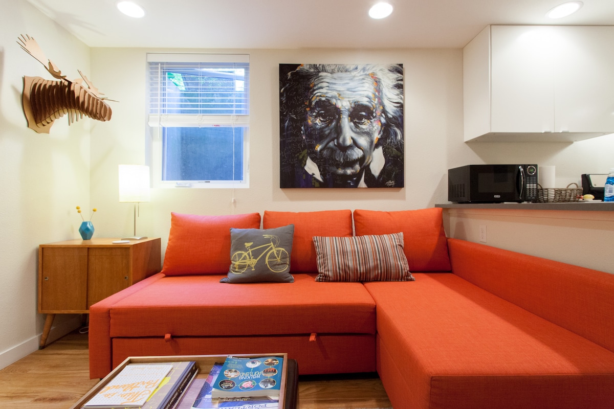 Enjoy a comfy retreat in this cozy and bright studio with a private bathroom, air conditioning, fireplace, full kitchen and work desk. Conveniently located within walking distance to local restaurants, coffee shops, retail stores, and parks. Centrally located in Portland and just 3 miles from downtown. Take a stroll through Historic Irvington and enjoy some of the most beautiful homes and old growth trees that Portland has to offer.