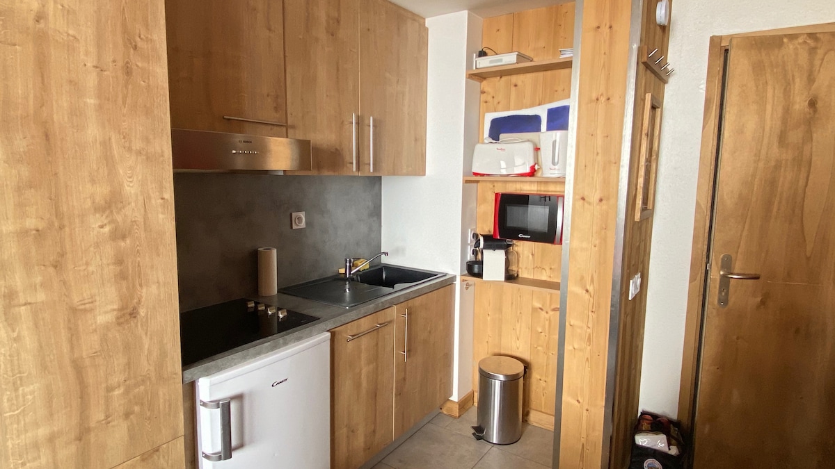 Luxurious 25 m2 studio fully renovated in 2022 (4 guests) is ideally located in the center of the station of Val Thorens ; just at a few meters of all shops, ski schools and rental centers. The residence is located on the main street; however the studio, at the 3rd floor, is oriented to the mountains and so is protected from the noise of the street by triple glazed windows. • REAL Ski in Ski out • Household linen included. The beds are made for your arrival • WIFI • Disney+ , Eng ch. • Ski box