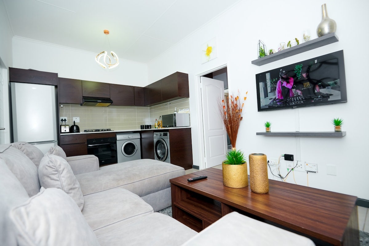 Our 1-bed apartment is perfect for a relaxing getaway. The calming white, cream & green colour scheme creates a serene atmosphere. The apartment features a comfortable bedroom, living room, fully equipped kitchen, & a private balcony with a braai area. Relax in the luxurious bathroom with a bathtub & enjoy the convenience of free 150 Mbps Wi-Fi & streaming services. Located in a safe & secure estate in Johannesburg (Modderfontein). You’ll be close to N3, OR Tambo and Sandton City (other malls).