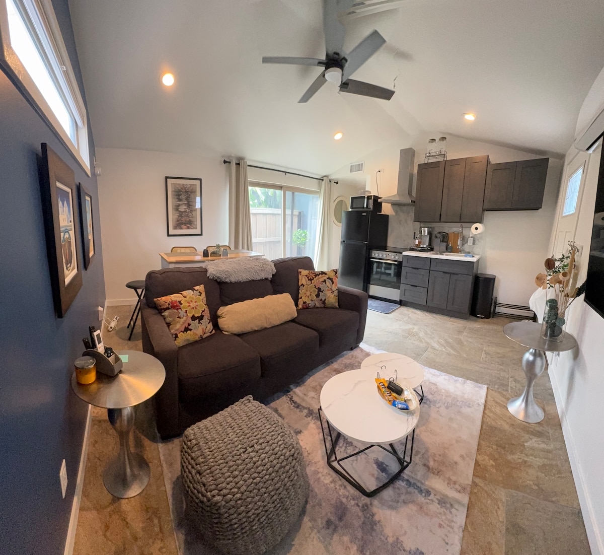 Bright, open-concept studio offers everything you need for a seamless stay: Plush Queen-size bed, a full kitchen featuring granite countertops, a full-sized range, and microwave. Modern bathroom with a spacious walk-in shower. Comfortable sofa seating, a flat-screen TV, and high-speed Wi-Fi. Private Entrance & Patio In-Unit Laundry: Full-sized washer and dryer. Quiet, powerful mini-split AC system. Easy Parking: Dedicated space in a safe, quiet residential area.