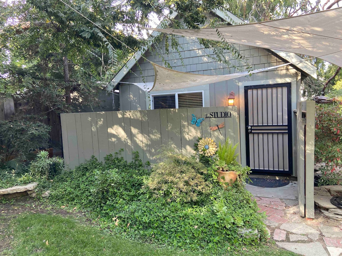 Unique large+light studio back house up stairs on top of storage garage. Minimalist boho style w/ lots of plants + comfy furnishings. Pretty sure you will love this space. Ultra-fast Internet + smart TV, built-in work desk, artesian wood cabinetry + counter tops+ wonderful just-added vintage wood flooring. Private entrance and yard with lots of trees, 95 yr old grape vine, strawberry beds +outside seating + free designated parking off an unpaved alley right in Turlock’s most desired area.