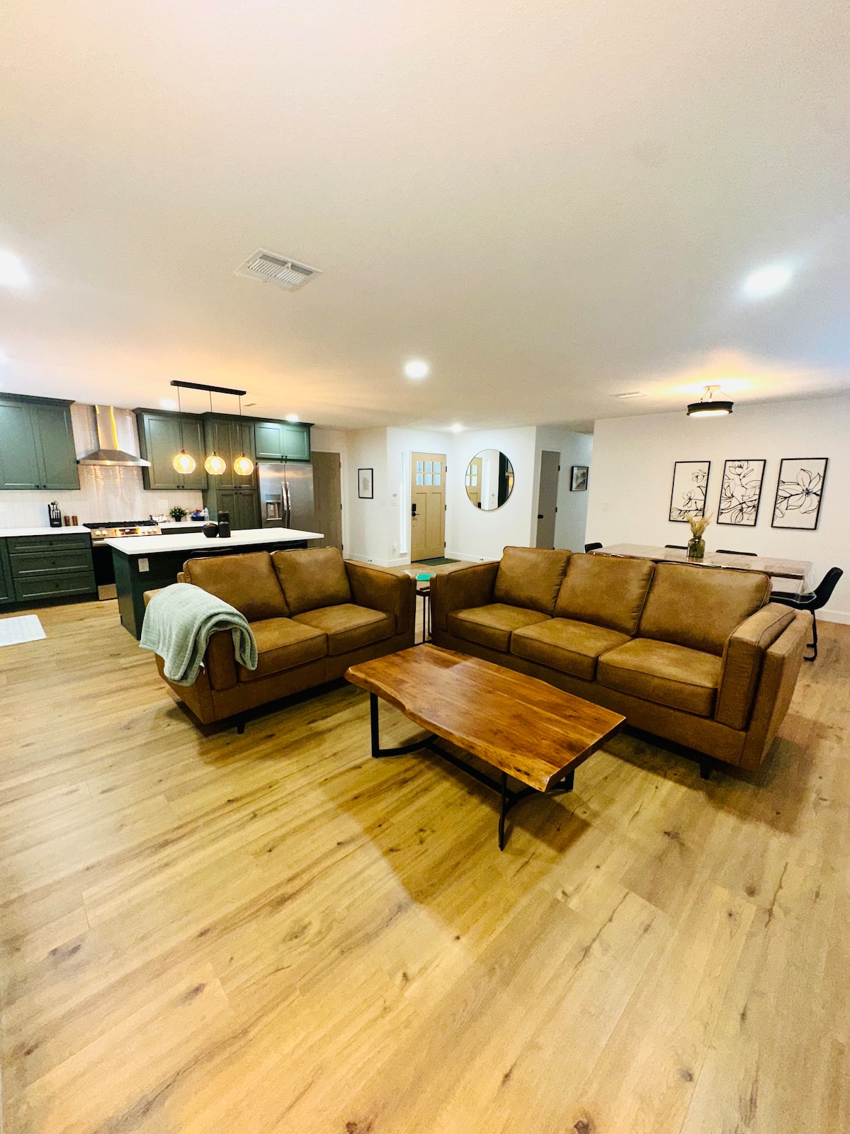 Welcome to your luxury retreat in Downtown Modesto! This fully remodeled 2BR/1.5BA Midcentury Modern home offers: • 1,150 sq ft of stylish double story home with spacious living space with new kitchen and baths • Large yard with paver-lined grass, Edison lights, and fire pit • 65” Smart TV, 1200mbps WiFi, 4K security system, and smart garage • Queen bed with desk, plus two twin beds, all with premium linens • Walking distance to fine dining, nightlife, and attractions