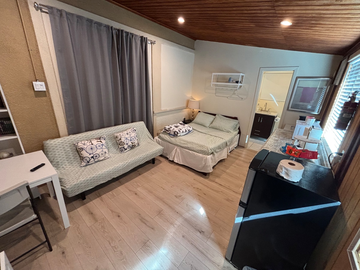 This unique place is on a dirt alley. It’s past owner turned it into a really cool “man cave”; he even left the big doors so he could live with his motorcycles! We obtained it, did some updating and it turned out fun! I changed out “man for car” because, well, that’s what it is. Plus ladies love it too. It’s really best for 1 person, a couple or even 3 or 4 friends or siblings that dont mind limited privacy (and parking) or climbing the steep ladder up to loft where there’s 2 more double beds.
