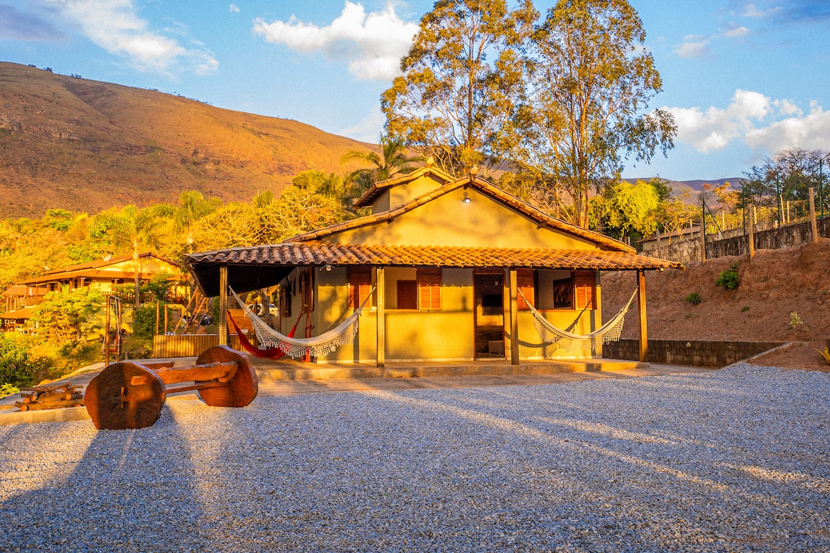 Imerso à natureza um refúgio romântico rústico, teto ecológico com visual encantador proporciona conforto térmico incomparável! Água corrente suave, relaxamento único, aproveite para colocar os pés na água e sentir a correnteza. Mirante com vista dos vales e morros, pôr do sol; em noites claras a lua, esse cenário é perfeito pra fotos inesquecíveis oferece relaxamento sem igual É de tirar o fôlego! Vizinho distante, a sensação de privacidade e conexão permanecem ainda mais intensa! ❤️ 💘❤️