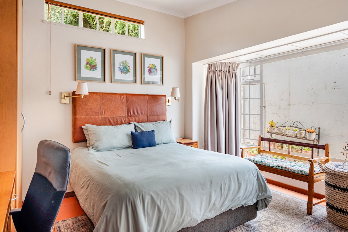 Recently renovated cottage by the pool with double bed with lounge area and a private braai area, kitchen, sofa bed and work station. ✔ Pool next to lush garden ✔ 50Mpbs+ WiFi ✔ Smart TV with Netflix ✔ Shaded parking for two vehicles ✔ Work space with ethernet connection ✔ Washing machine ✔ Dishwasher ✔ Fridge ✔ Gas Stove ✔ Microwave Oven ✔ Fully loaded kitchen utensils. Situated in a central location and close to all amenities. Suitable for three people. Suitable for long term stay as well.