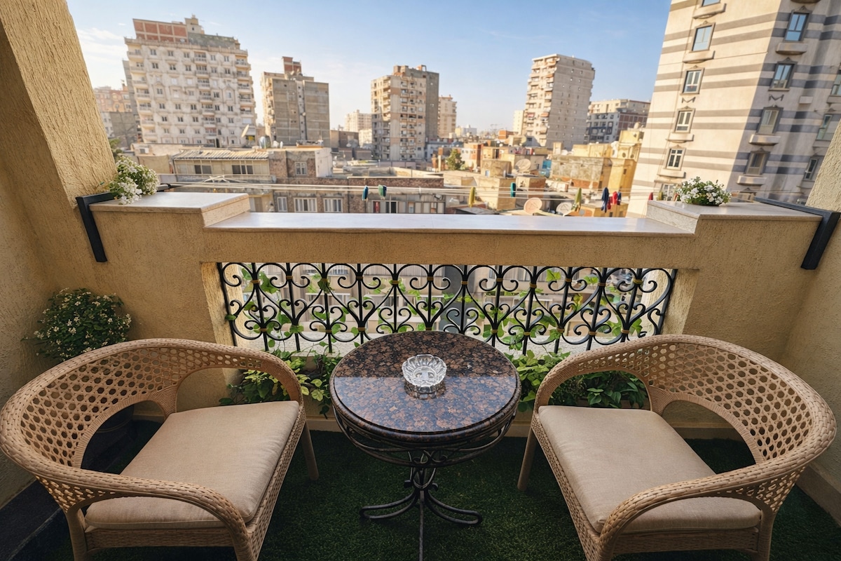 Stay in the heart of Alexandria! Spacious 2BR with work desks, balcony, full kitchen, Wi-Fi, Smart TVs, iron, washer, dining & living areas. Fathalla Market and National Bank of Egypt are in the same building—shop everything you need at the best prices! Near Muharram Bey & Masr Station, and close to top attractions. Your host is ready to assist—book now for a perfect stay!