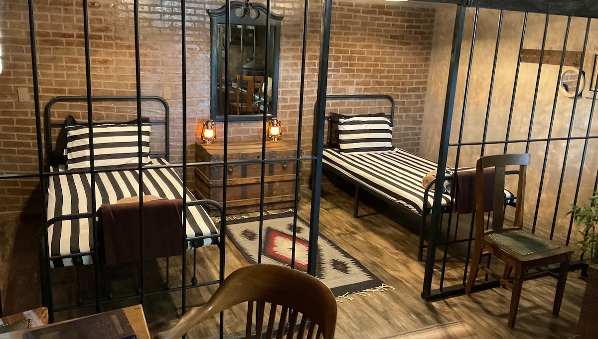 ✅We are not a self check in property. ✅We require 1 day advance notice to book ✅Bathrooms and shower are adjacent to the jail. ✅NO PETS, NO SMOKING Come stay at the Old time jail at Azblue Ranch Retreat! You will love this unique bunk style themed private room! It is private, and set aside by itself on the Main Street and offers 2 bunks, tv, internet , microwave, refrigerator, a Keurig, and seating area. It is set in our serene and quiet theme park. Come on out you will love this place!🤠