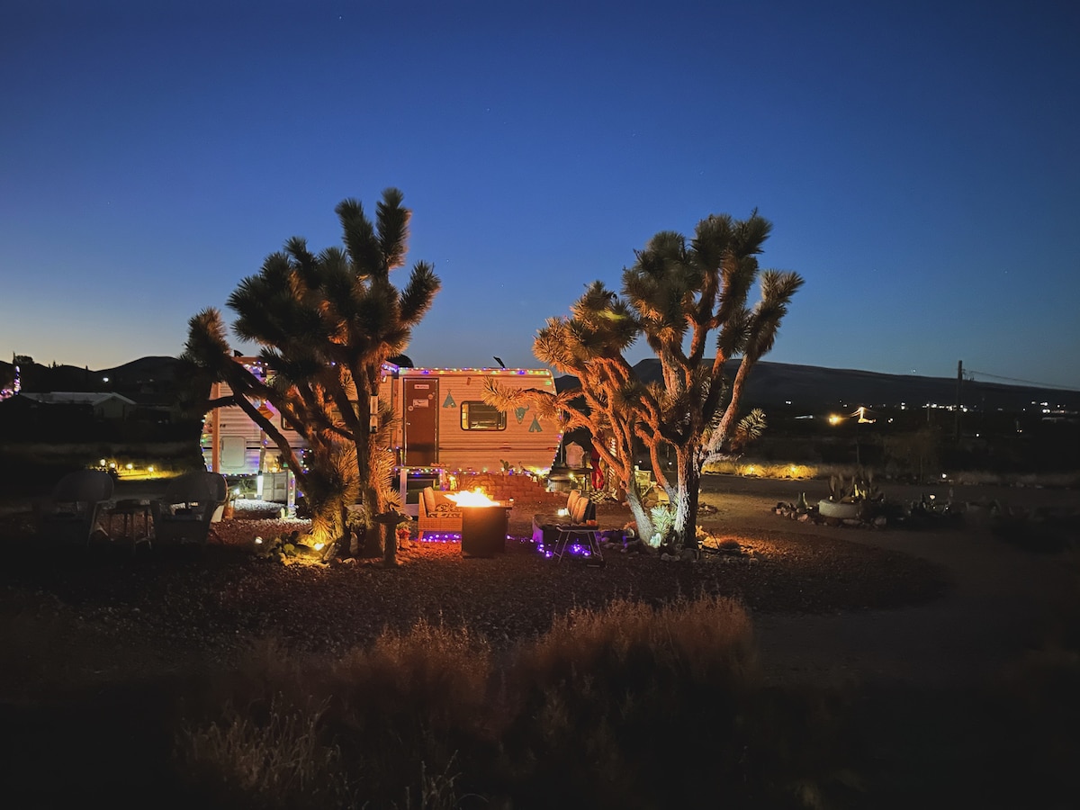 The Broken Arrow Camper is a restored camper. Southwestern Styled. Vintage & Retro. It is nestled amongst beautiful Joshua Trees and a cactus garden on our well maintained property. Reading the full description of our place is important. WE are LGBTQ friendly. No Haters please. **We are located directly off the MAIN road In the old western run down town Dolan Springs which leads to The Grand Canyon West Rim. ***Be aware that on full moon nights the coyotes howl all night.