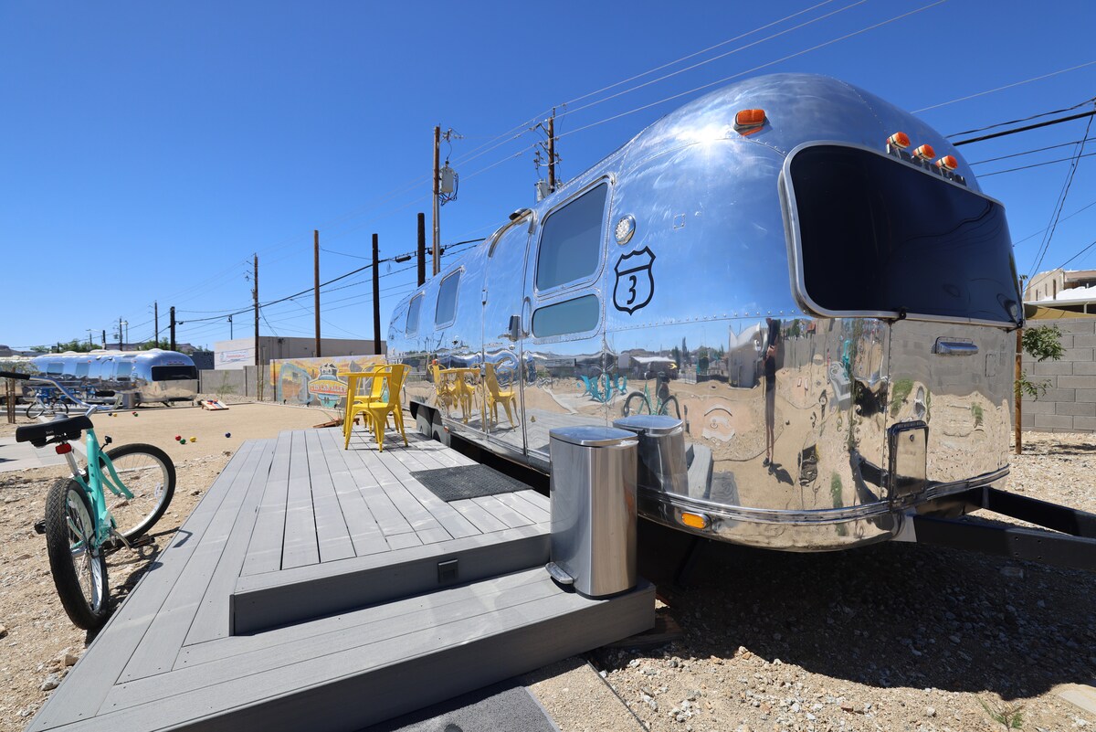 Located in historic downtown Kingman, Arizona on the famous Route 66, Tin Can Alley on 66 is an oasis of vintage Airstreams modernized to provide you with a one-of-a-kind boutique experience. Just steps away from pubs, restaurants, shops, trains, and museums, you will enjoy the sights and sounds of the Route. Be prepared to experience train engines, classic cars, historic sights, friendly folks, murals, and neon in this 1882 railroad town!