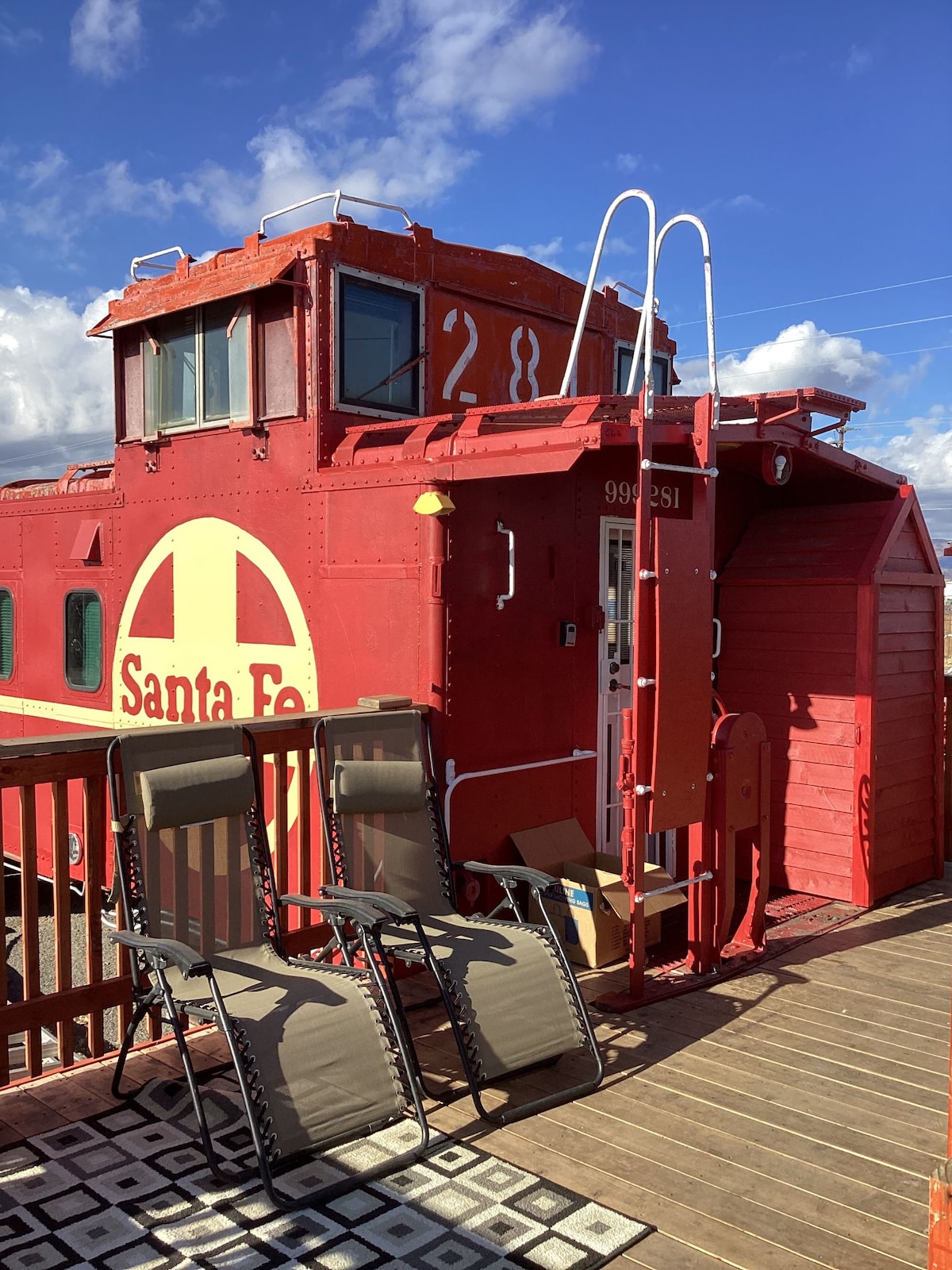 This romantic Caboose in Kingman, Arizona offers old-world tiny-house charm, a soaking tub, amenities like wifi, kitchenette, hvac, and self check-in. This open plan inside a historic train car caboose offers a relaxing getaway. A porch area offers a relaxing sitting area outside, with a gazebo around the corner. This booking is an "Experience Airbnb" at AZ's oldest craft distillery with available tastings just steps away. Tours, tastings, craft cocktails oh my!