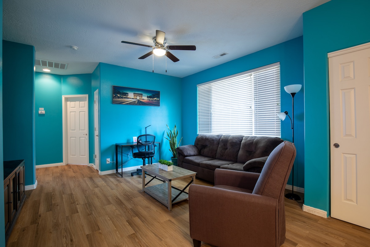 Beautiful Condo w/balcony and an additional game room with air conditioning and a bar in garage. It also includes a swimming pool, hot tub, playground and exercise room on-site. Located across the street from a park. Includes Wifi, Private driveway, 3 Smart TV's with over 70 channels. Centrally located in the heart of Mesquite.