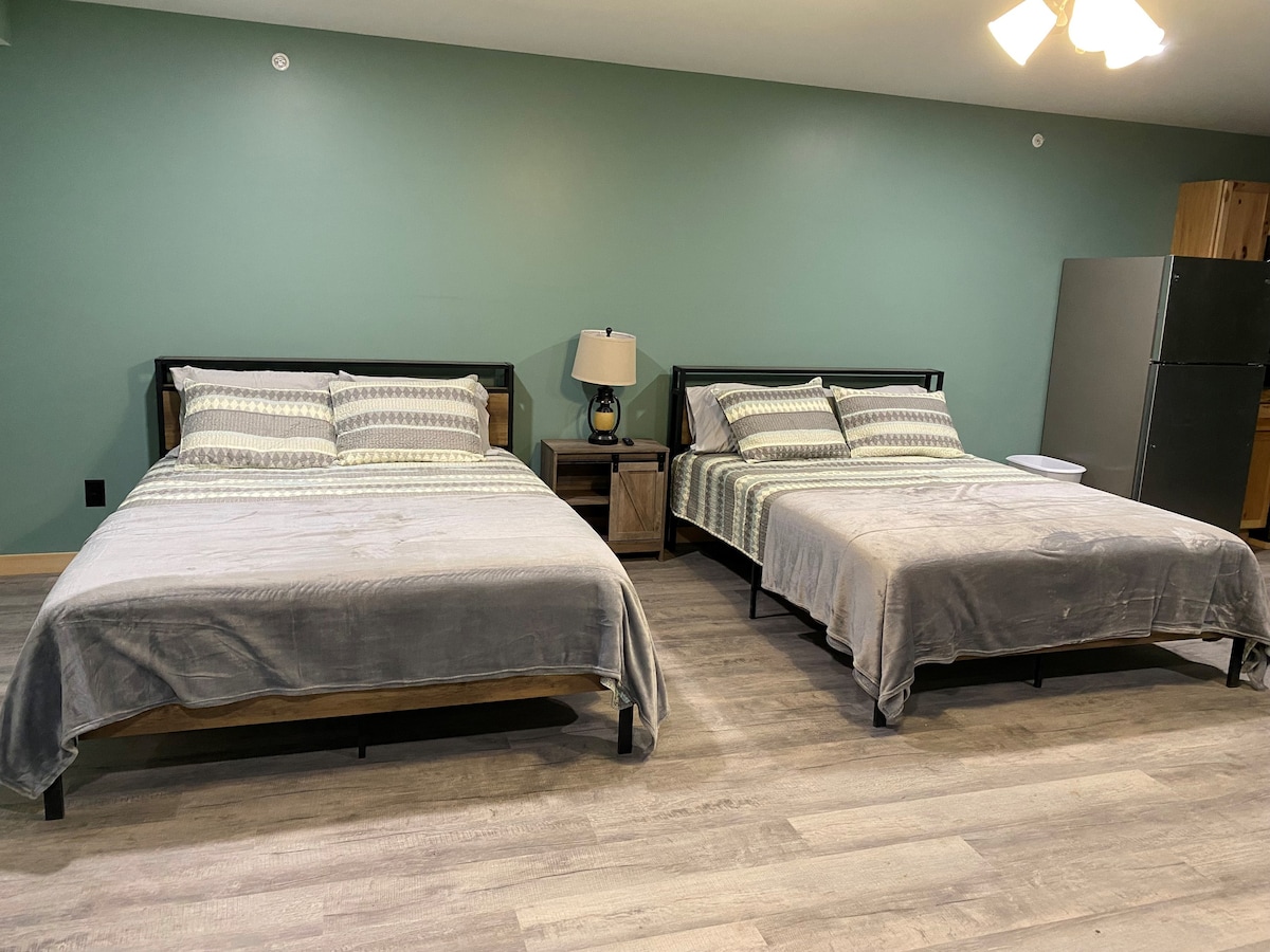 Snowmobilers Paradise! Abundant parking & on trail 5 Our pet-friendly beachside rooms sit just off our private, sandy beach on 4th lake, complete with comfortable seating for 2. This unit features: 2 queen fully adjustable beds Smart TV Shower Dining table with seating for 4 Heat and air conditioning Granite counter 2 burner cook stove Refrigerator and freezer Microwave Linens, towels and hand towels Paper towels and toilet paper Washcloths Keurig coffee maker Shampoo & Conditioner