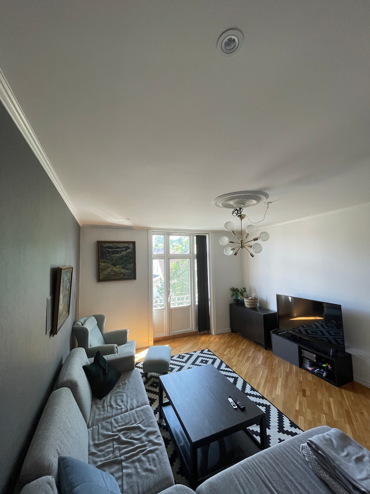 This is a cozy apartment, located in the city center of Trondheim. You will have the entire place to yourself: Two bedrooms, a spacious living room, a kitchen, a bathroom and a balcony. The apartment is 68 square meters large and is located on the first floor (Norwegian second floor) of an old town house with high cealings and deep window sills. The apartment is ideal for 3 adults or 2 adults and 2 children.