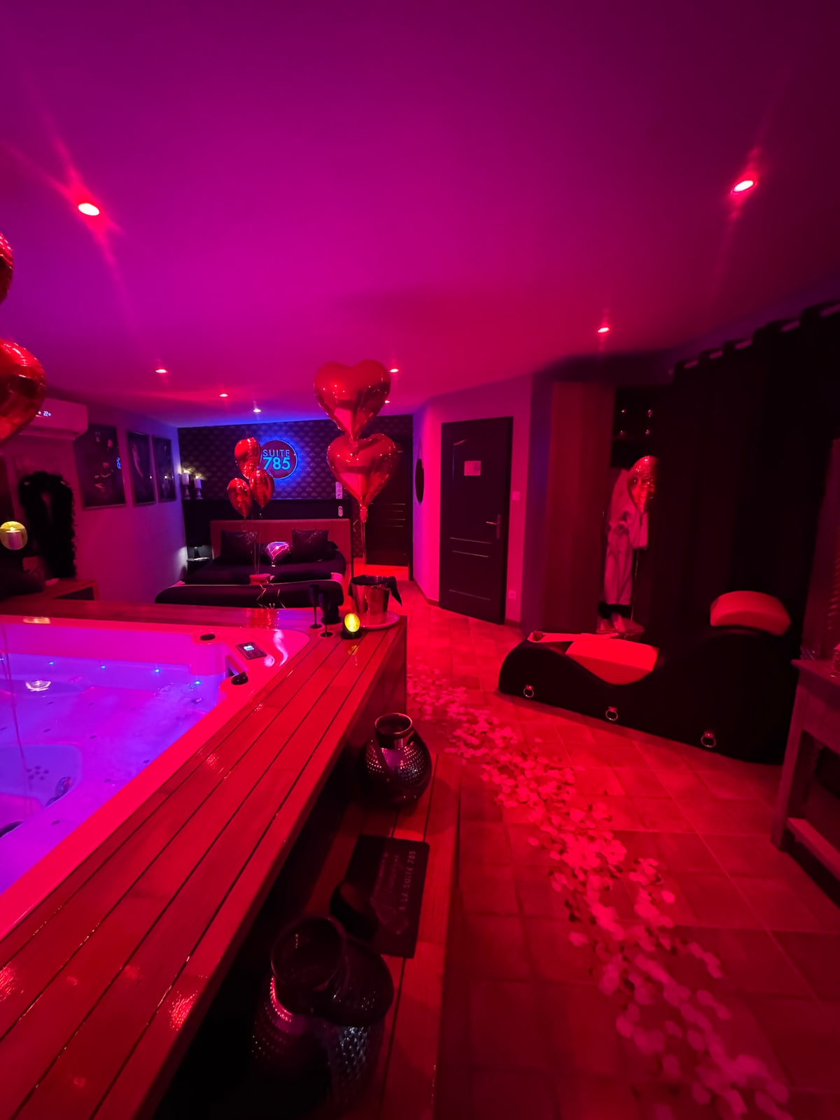 SUITE 785 est élégante et luxueuse chambre d'hôtes Loveroom, elle promet un séjour inoubliable, prestation de qualité. Digne des plus belles chambres des Grands Hôtels luxueux. Se situant à Montauban proche de Toulouse Un espace Spa Jacuzzi 5 pl., parfait pour se détendre et un Sauna 2 couchettes. Sa cave d'exception pour le plaisir des yeux, une borne arcade pour les nostalgiques Le tout indépendant, privé , non partagé Un jardin cosy avec bain de soleil et salon pour une détente absolue