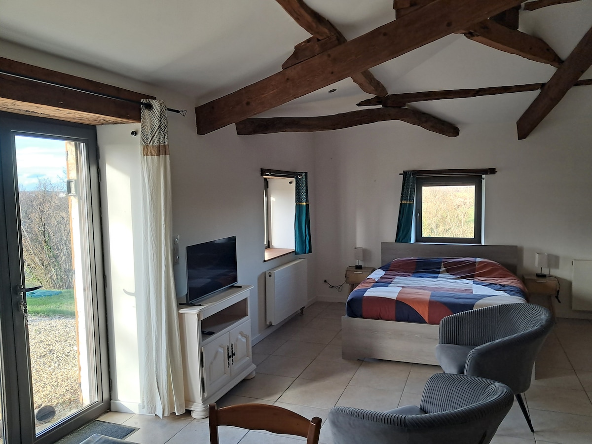 Petite maison de 20 m2 , en pleine campagne. Restaurée avec soin, elle comprend un séjour équipé d'un canapé lit 2 places, d'une kitchenette et d'une salle de bain chaleureuse type chalet. Elle dispose d'un poêle à bois. Elle profite d'un espace ombragé équipé d'un barbecue et d'un salon de jardin et d'un espace qui s'ouvre sur un large paysage de campagne. Un ruisseau longeant la praire, des chemins de randonnées et le village médiéval à proximité invitent à la balade .