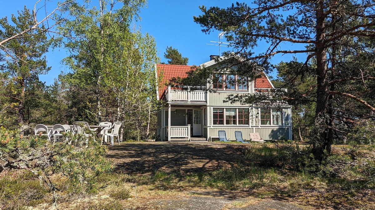 Unique location on a large plot by the sea with two houses, privat located in Stockholm archipelago. The houses are connected by wooden deck, all rooms with seaview and terracedoors. Large kitchen fully equipped with dining for 6-8 persons. 50 m to privat jetty. 4 bedrooms with privat entrance. Outdoors shower and separata house for longdrop toilet (TC). A small rowboat is included and you can rent a smaller motorboat. You can rent sheets and towels. 15 min. walk to ferry to Stockholm.