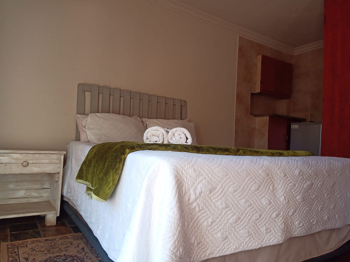 This modern self catering unit is situated in a quiet area yet close to town. It has a queen size bed, spacious walk in shower and a kitchen with a full size fridge. You also have a verandah where you can either relax or sit and work.