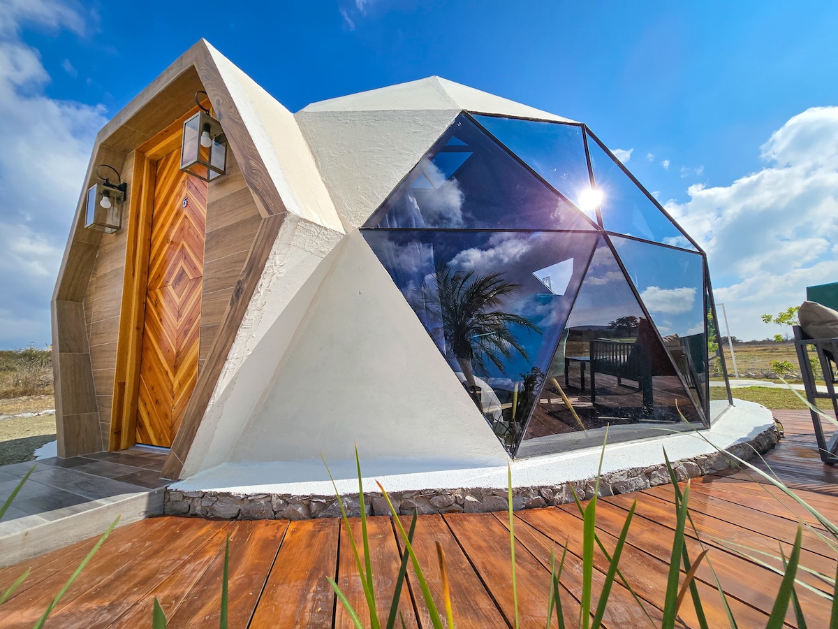 Vive una experiencia única alojándote en este lujoso y comodo domo geodésico, único en su tipo y en la region, y a tan solo 20 minutos de las majestuosas grutas de Tolantongo. Excelente ubicación privada y tranquila, cerca a restaurantes de barbacoa, fondas y tiendas, maravillosas vistas a las montañas, todas las comodidades de un hotel, pero en contacto con la naturaleza. *Aire Acondicionado *Smart tv *Cocineta equipada *Fogatero *Alexa *Sala exterior