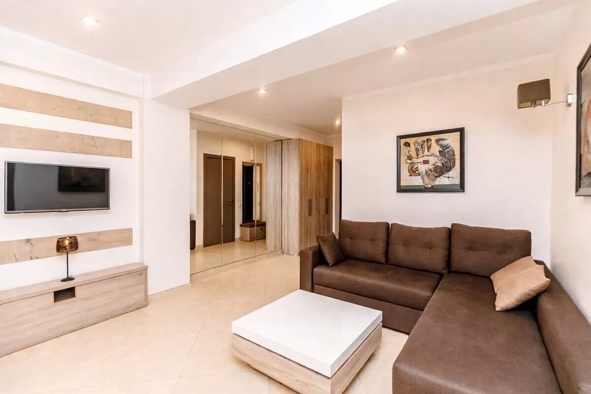Cazare elegantă, stil neoclasic, spațioasă 98 m2, într-un bloc nou,zona rezidențială liniștită lângă parc (amenajat cu locuri de plajă,sport și recreere pentru copii și maturi).La 5 minute de mers pe jos de Shopping Mall ( Bănci, Market, Restaurante, McDonald's, Cafenele, Cinematograf, Bowling) si la 1,5 km de centrul orașului. Transportul public este usor accesibil. Bucatarie complet dotată, 2TVsmart, Netflix, WiFi Curățenia locuinței și confortul clienților este prioritatea noasta