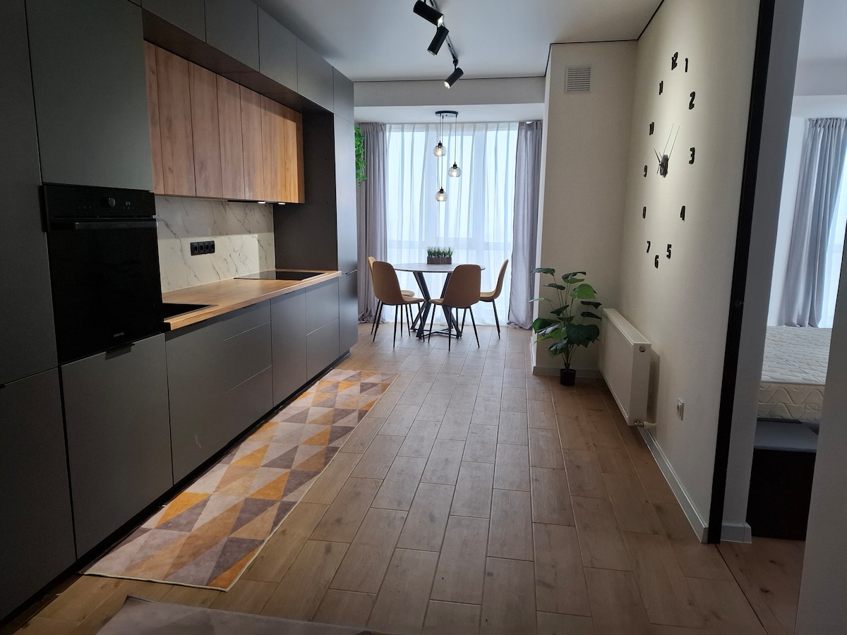 Современая квартира в новом доме в центре города по улице А.Пушкин 47/5,в 5 минутах ходьбы от главной улицы столицы.Вы сможете наслаждаться приятной атмосферной в центральном парке "Alexander Puskin" также в нескольких шагах находиться торговый центр Sun City . Современные интерьер,панарамные окна , сделают вашим прибытьем, идеальным домом во время визита в Кишинев, самый большой город Молдовы.