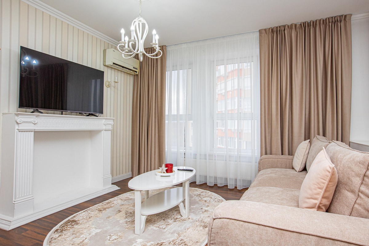 This apartment is situated in the heart of City Center. It’s a two-room flat on the second floor of a multi-storey building. Our flat consists of living-room, bedroom, kitchen, bathroom and balcony. It’s big, bright, clean and comfortable for guests. We will be happy to welcome you in our apartment!
