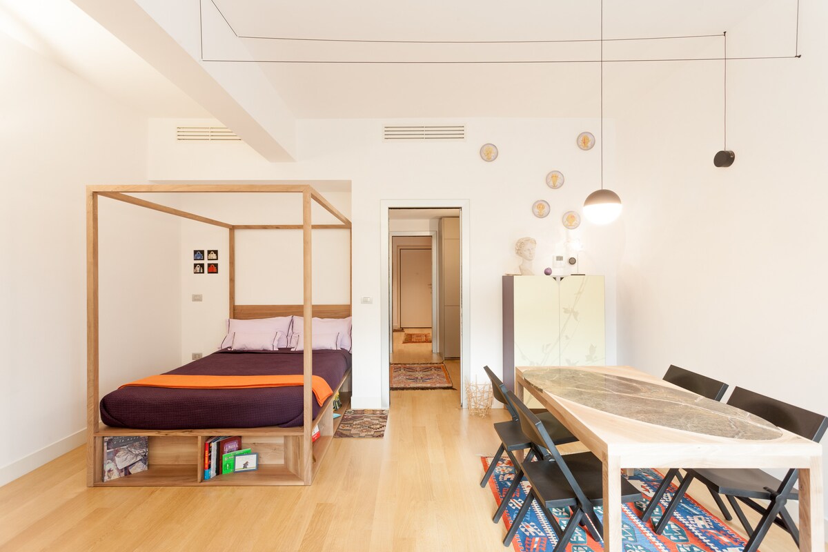 The apartment overlooks Valentino park on its north side: it’s located on the first floor of an elegantly renovated historic building in Turin. It is a studio apartment with fine finishes, divided into 4 separate areas: entrance with wardrobes, kitchen, bathroom and single dining room+living room TV + bedding. The whole is particularly appreciated by lovers of architecture and design and by those who love healthy activities in the park, but also by those who prefer to travel in style and comfort