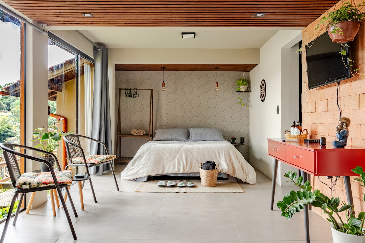 Loft com lindas vistas para Praia Mole e Lagoa da Conceição em local seguro, tranquilo e com natureza exuberante. Acomodação aconchegante a dez minutos de caminhada até a praia. O espaço possui 40 m2 internamente, um amplo deck e quintal. Observações: 1. para acessar o local, é necessário subir uma estrada inclinada e manobrar um pouco para estacionar (qualquer carro consegue subir); 2. A acomodação fica em andar superior sobre a casa aonde vivem os anfitriões e é acessada por entrada separada.