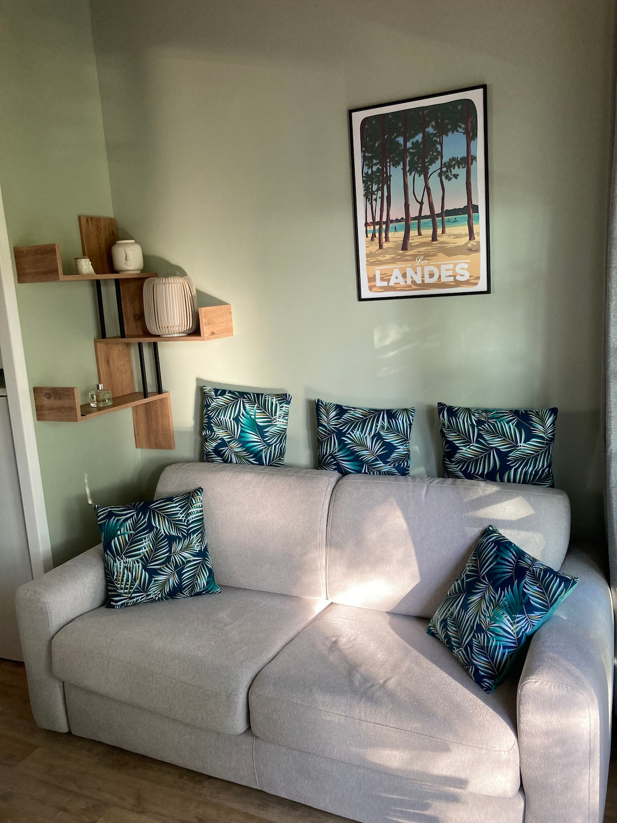 Situated near Hossegor lake (500m) and near Seignosse beaches (700 from Estagnot beach), this studio flat is perfect for two people. Its balcony has a nice view over the pine trees. 5 minutes walk from convenience stores (bakery, restaurants, supermarket...). Its configuration: little room (bed 140cm, )bright living room (1 sofa) and balcony with table, equipped kitchen (nespresso machine, fridge, electric hob, micro wave, ...), shower room with toilets.