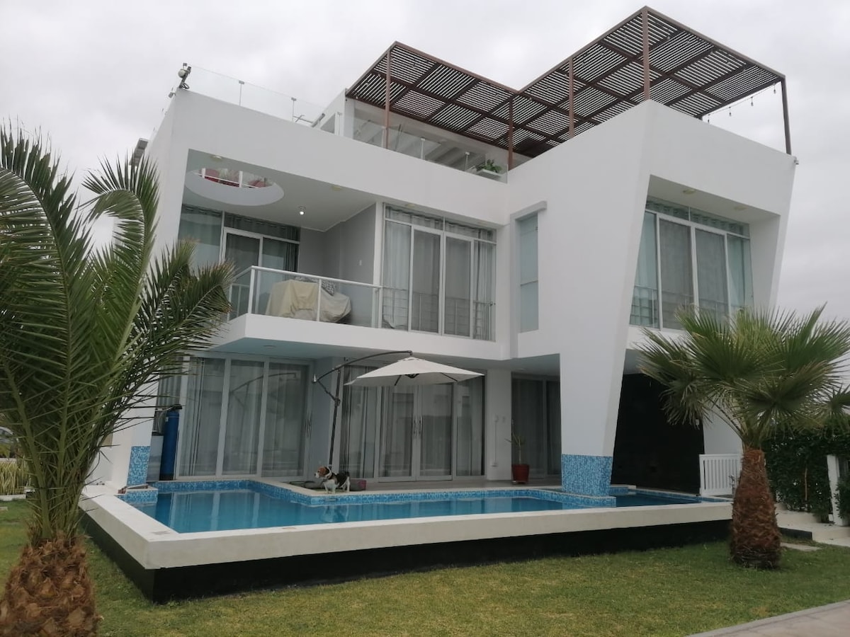 Relájate con toda la familia en este tranquilo lugar para quedarse en vacaciones. Contarás con una casa completa con amplia piscina en el primer piso, acceso directo a la playa, terraza con parrilla, agua caliente, todos los servicios y completamente amoblada. Además podrás disfrutar de las instalaciones de nuestro condominio como canchas de froton, tenis, fulbito, Voley, piscinas y fogateros en la playa. Ideal para familias.