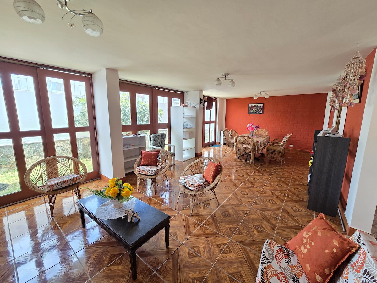 Relájate con toda la familia en el campo a solo 5 minutos en carro de la playa. La casa cuenta con: - 1 habitación matrimonial, 1 - 1 habitación con 2 camas de plaza y media y - 1 sofá cama en la sala. Nota: Tomar en cuenta que por la zona no pasa transporte público ni taxis.