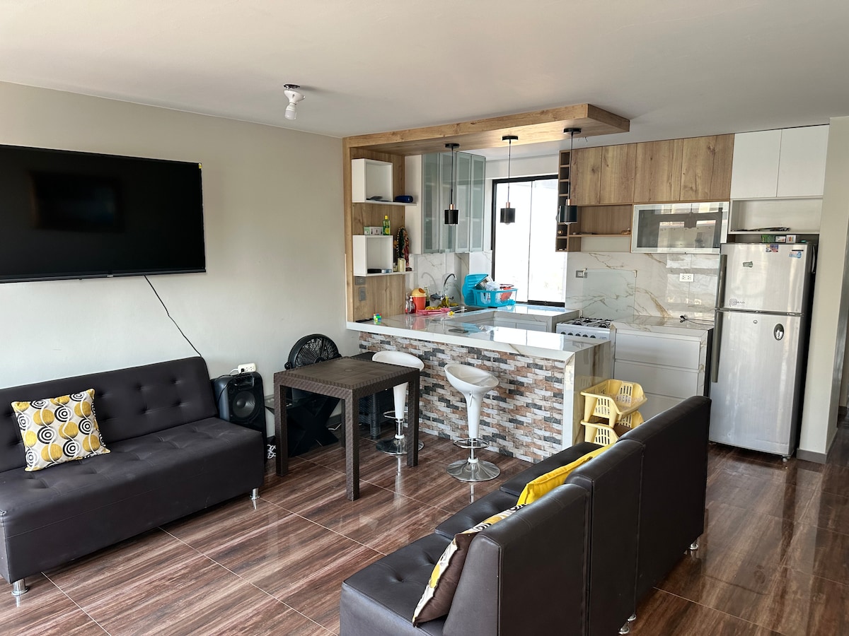 Hermoso departamento en estreno en primer piso en la Av. Navarrete, y a 2 cuadras de la Av. Panamericana, cerca a Restaurantes, el grifo y al mercado. Cuenta con zona de lavandería sala amoblada agua caliente un pequeño patio para compartir y cocina equipada. Un lugar bello para pasar unos días. 2 dormitorios Una cama de 2 plazas y otra de plaza y media 1 sofá cama para 2 personas Cocina Comedor. 1 baño completo. Patio. Ubicado en Av. Navarrete.