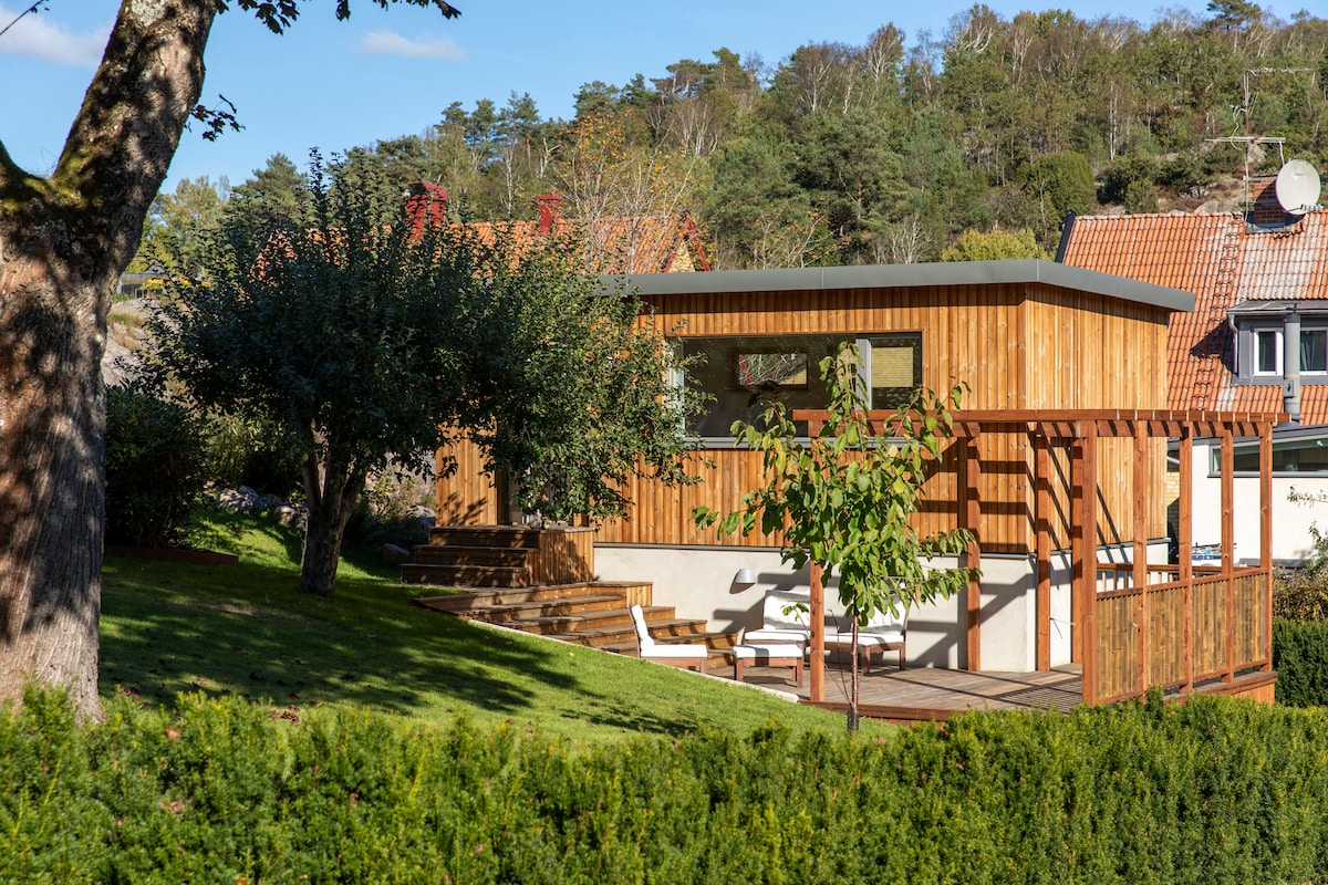 Slappna av i detta unika och lugna boende med utsikt som sträcker sig över hela askimsfjorden ända ut till Tistlarna. Här kan ni sitta och studera naturen, skärgården, höra måsarnas skri till morgonkaffet och gå ner och ta ett morgondopp det första ni gör. Barnen kan röra sig fritt i området då det inte finns någon direkt trafik, istället är det fina naturområden runt knuten. Här finns närheten till Göteborgs centrum(14min), stillheten och fina bad. Varmt välkomna till min gäststuga!