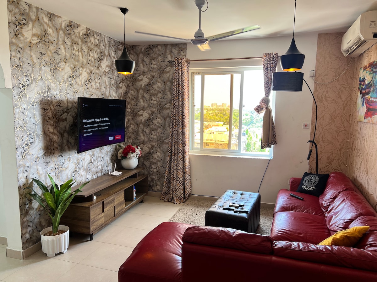 Living Room -58-inch Smart TV -Comfy couches Dining area / Study / Workstation -Bar stools for casual dining or a quick coffee -Fast WiFi -Beautiful wall art -Water dispenser with clean water Kitchen -Fridge -Cooker -Microwave -Hot water jar -Full set of cooking utensils Bedroom -King-size bed -Orthopedic mattress -Mirror -Beautiful artwork -Cloth cabinet -Air-conditioning Washroom -Hot shower -Toilet with modern fittings -Complimentary toiletries -Fresh towels -Shower -Mirror