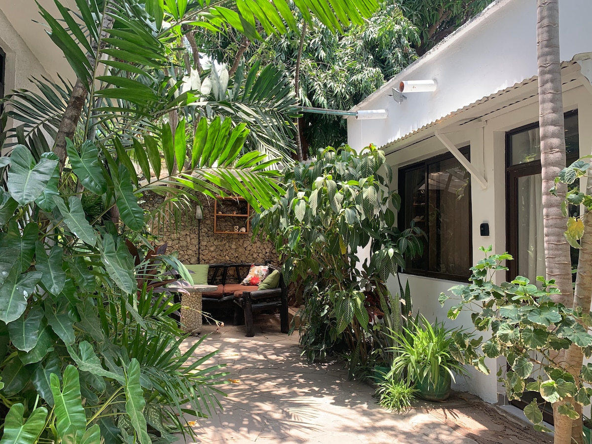 Rest and relax both inside and out in a Private Home. The house is 15mins minutes walk and a 5mins drive to Nyali beach. - Has a twin bed. - Flat screen and free WiFi - Closet equipped with hangers and drawers + iron box - Well-equipped kitchen - spacious, clean bathroom The studio is a detached private guesthouse in the back of the property. There are 3 houses in the compound; Guests will have their privacy and entry area and backyard space.