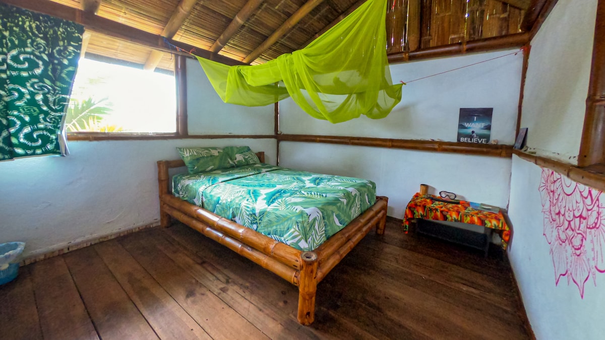 Cabin accommodates up to 6 guests on two floors with and private bathroom. Right on the beach, the cabin offers stunning views of Mompiche's bay and point break. Access to a communal kitchen, dining area and thatched roof hammock area. Parking space is provided. May arrange, jungle tours, mangrove tours, visit to chocolatier and biodiverse cacao farm. The Madre Selva Restaurant is part of the Casa Banana complex and our guests may receive a discount provided arrangements are made before hand.