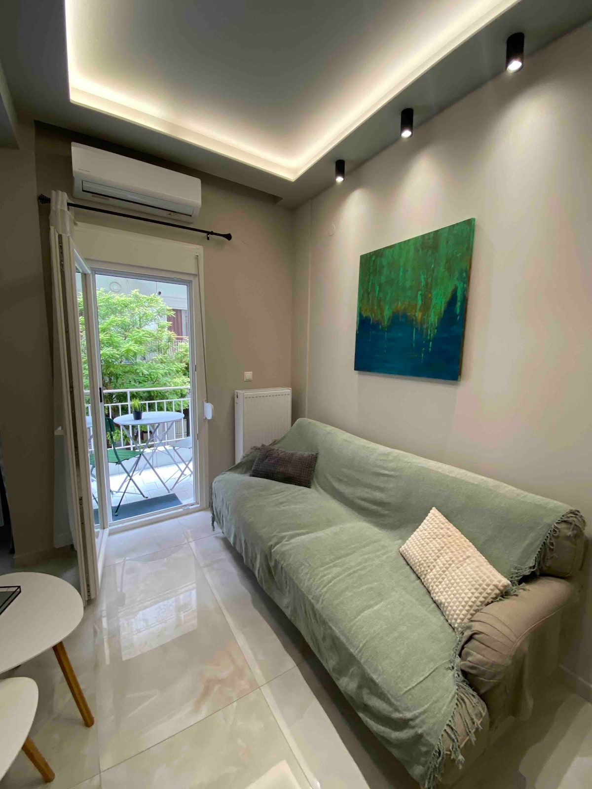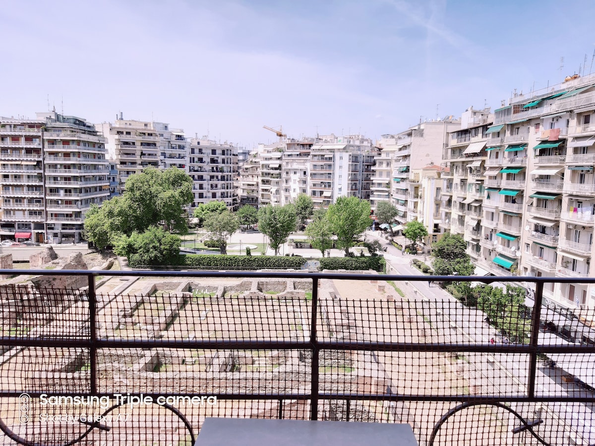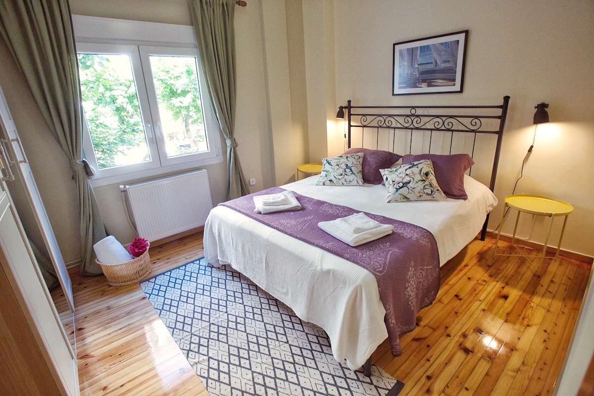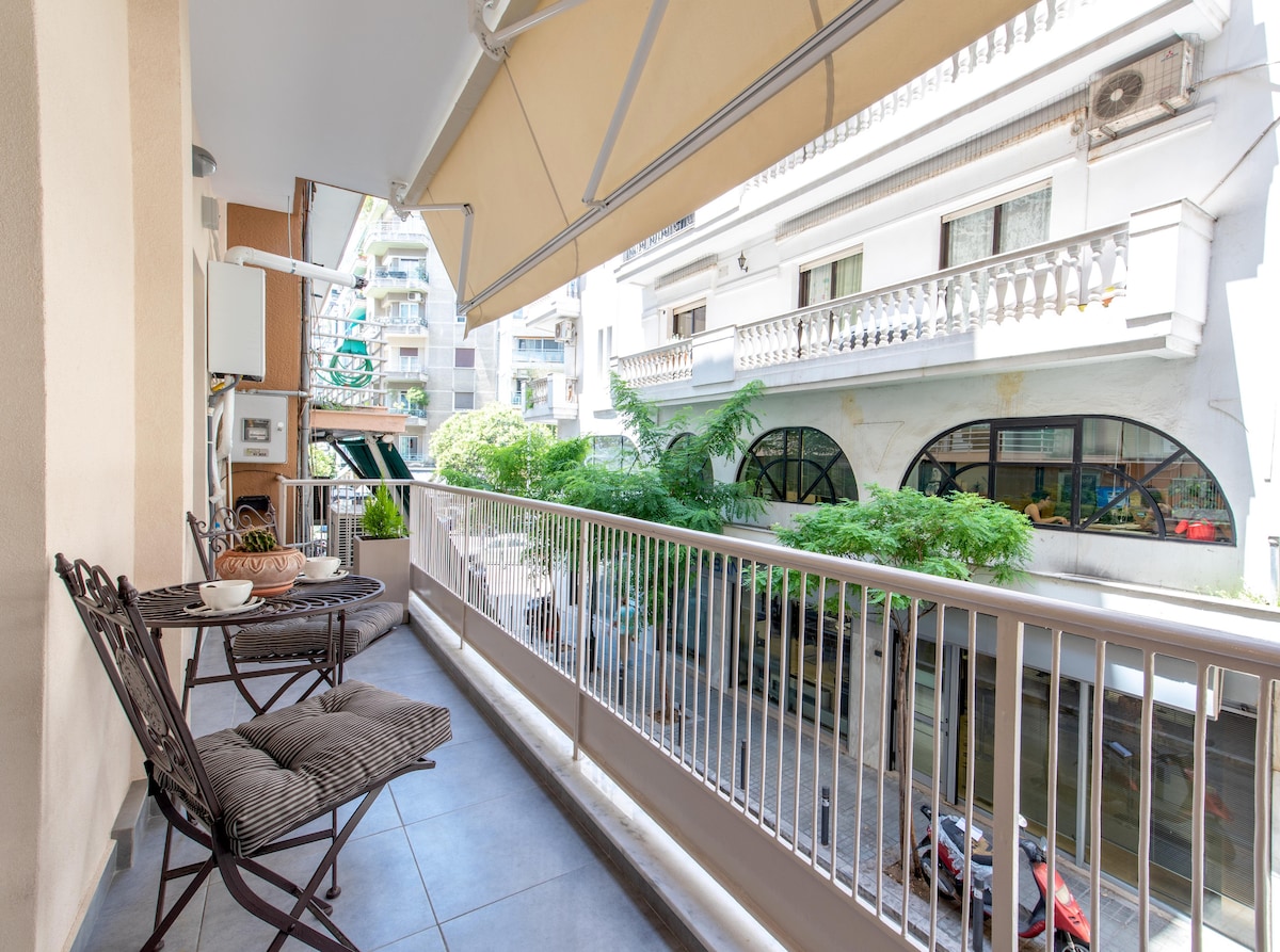 Comfortable apt right in the BEST neighborhood of the city center! -2 steps from Navarino square & Tsimiski street - the city's shopping area -6 min walk from the Waterfront & the White Tower ! -Spacious, bright with 2 queen size beds (1 bed + 1 sofa bed) -Wifi 300mbps, AC with ionizer, insect screens, water filter -Big supermarket underneath -Parking at economical rates -Recently renovated, Fully equipped Ideal for couples, single travelers, executives, friends & families with children.