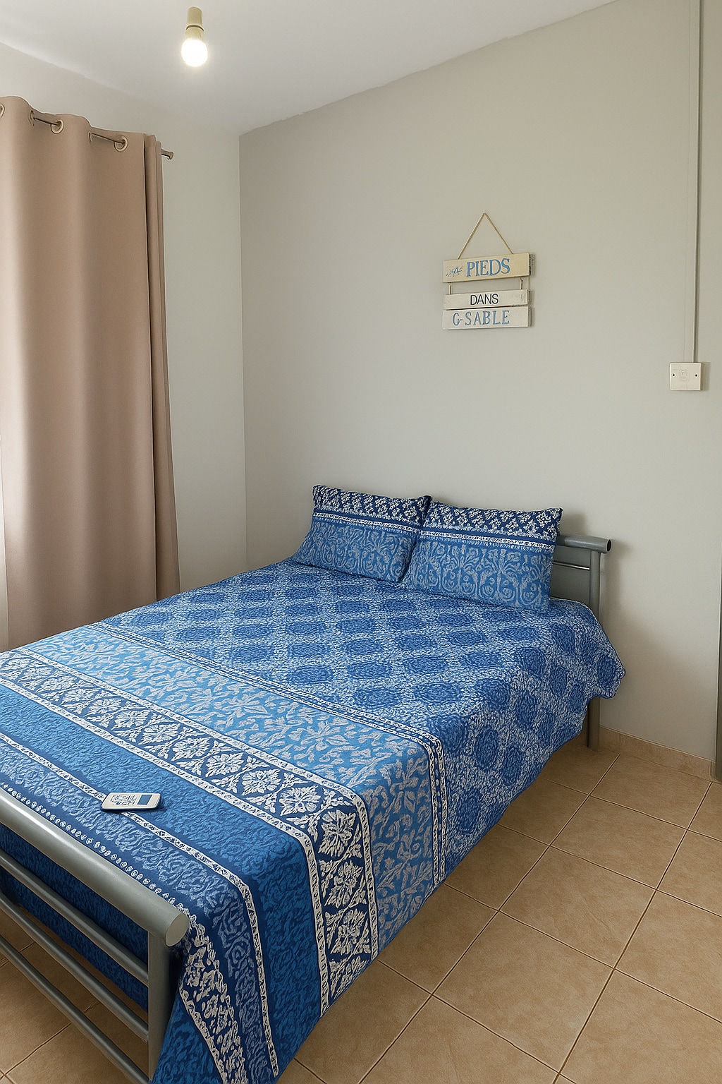 One bedroom apartment located in residential area of Pointe aux Canonniers, on the ground floor of a 2-storey building. Featuring one bedroom en-suite, a spacious terrace overlooking the swimming pool and garden, small living room and equipped kitchen. Ideal for a couple on a holiday trip. French bakery just around the corner, 2-3 restaurants, local shops and bus stop at walking distance. It is 5-10 mins from the center of Grand-Baie and 900m from Mon Choisy public beach (3 mins by car).