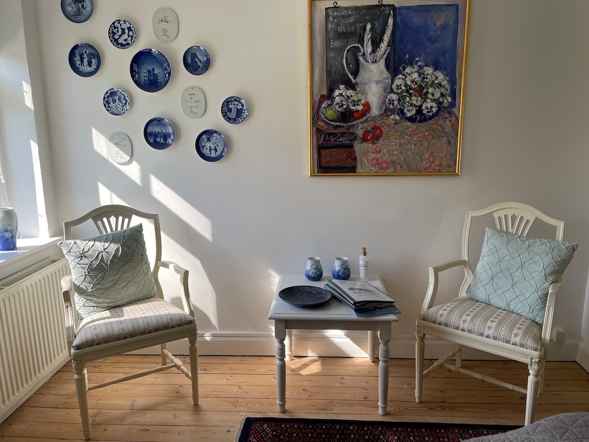 Jeres værelse ligger i hovedhuset i en ejendom fra 1923. Værelset er nyrenoveret og vender mod vest med udsigt til solnedgang over Stege bugt og Dronning Alexandrines bro. I er velkomne til at bruge den store have med æble, pære, kirsebær og figentræer, der er sat stole frem så i kan nyde udsigten og roen med et glas vin. Det er muligt at bestille middagsmad og morgenmad der serveres i vores store og hyggelige spisestue.