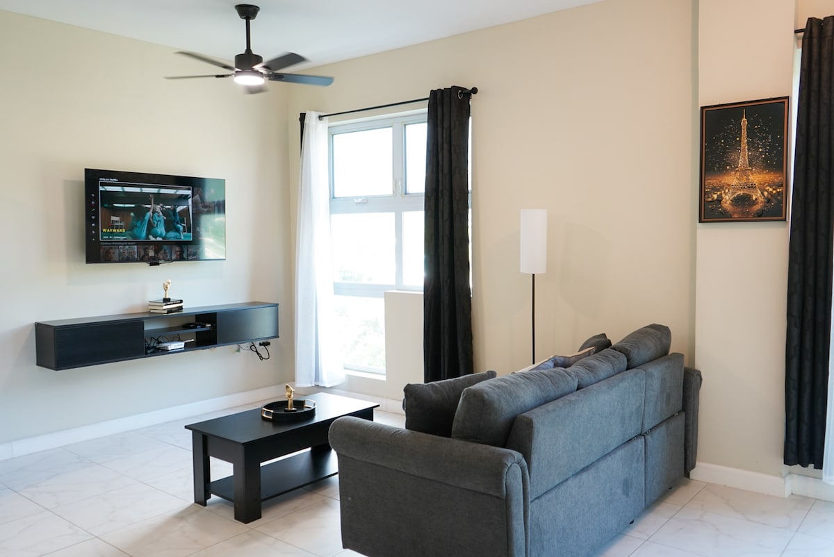 Enjoy a stylish experience at this centrally-located place. This 1 bedroom apt is all you need which boost 24 hrs security with a resort style pool also you may take the elevator and have a breath taking view of the city of Kingston!!!! Centrally located to restaurants, night clubs, spas, shopping centers and supermarkets.