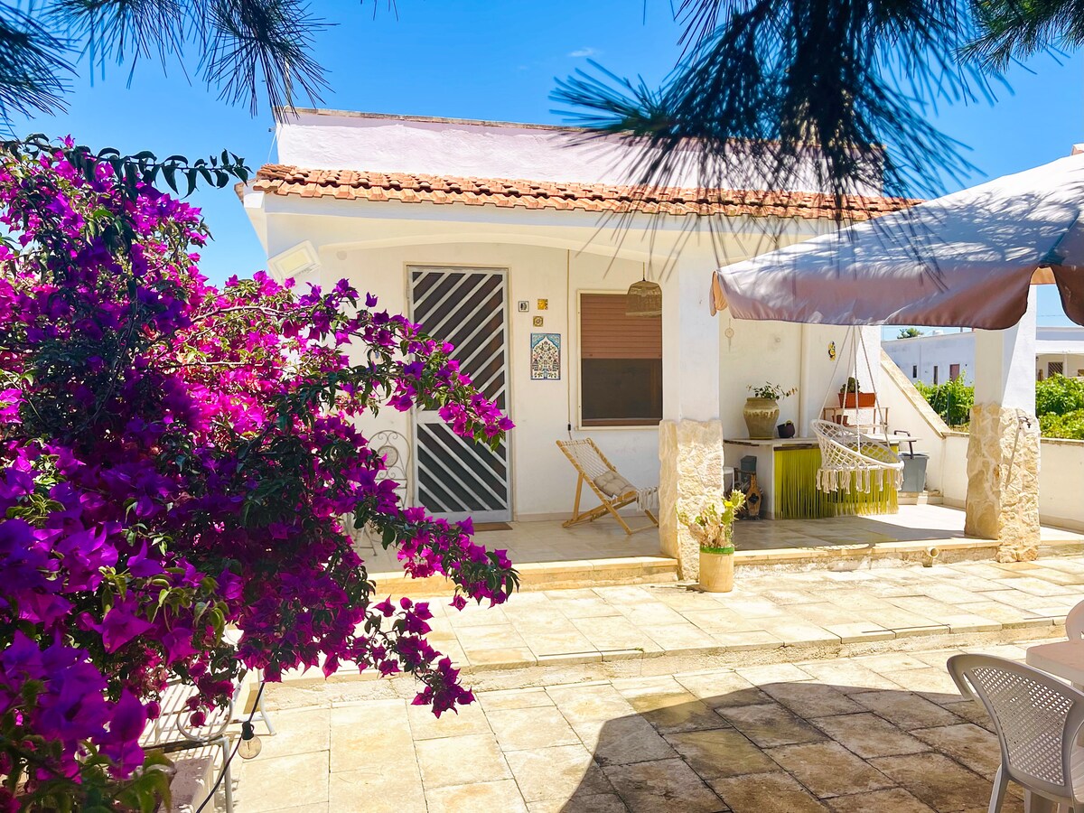 Villino a soli 200 m. (3 minuti a piedi) dal mar Ionio. Composto da 2 camere da letto, 1 bagno ed un’ampia zona living con angolo cottura. L’abitazione è dotata di molte zone esterne: -Ampia veranda coperta -Veranda d’ ingresso -Piazzale con forno e barbecue -Giardino -Terrazza Solarium&Relax con vista mare/terra. Puoi scegliere tra scogli (3 min a piedi) e sabbia (10 minuti a piedi). La casa è a pochi km da Torre Ovo, Campomarino, San Pietro in Bevagna, Marina di Pulsano, Porto Cesareo.