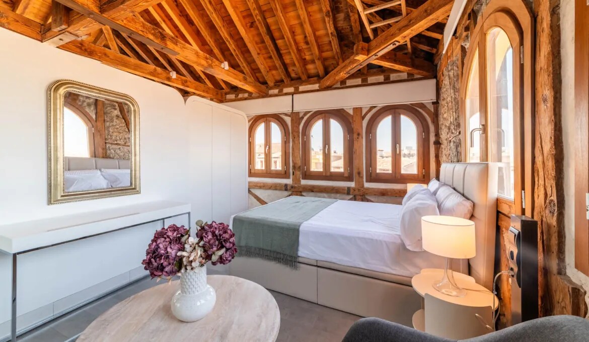 El apartamento Sinagoga 6 está situado junto a la catedral, y dispone de terraza privada de 45 m2 con unas vistas magnificas a su torre. Ocupa la segunda planta y terraza de un edificio construido hacia el año 1900. Tiene unas magníficas vistas sobre la catedral y está situada a escasos metros de la calle Hombre de Palo, arteria principal de la ciudad que conecta Zocodover con la plaza del Ayuntamiento y Catedral. La casa ha sido objeto de una restauración integra en su interior.