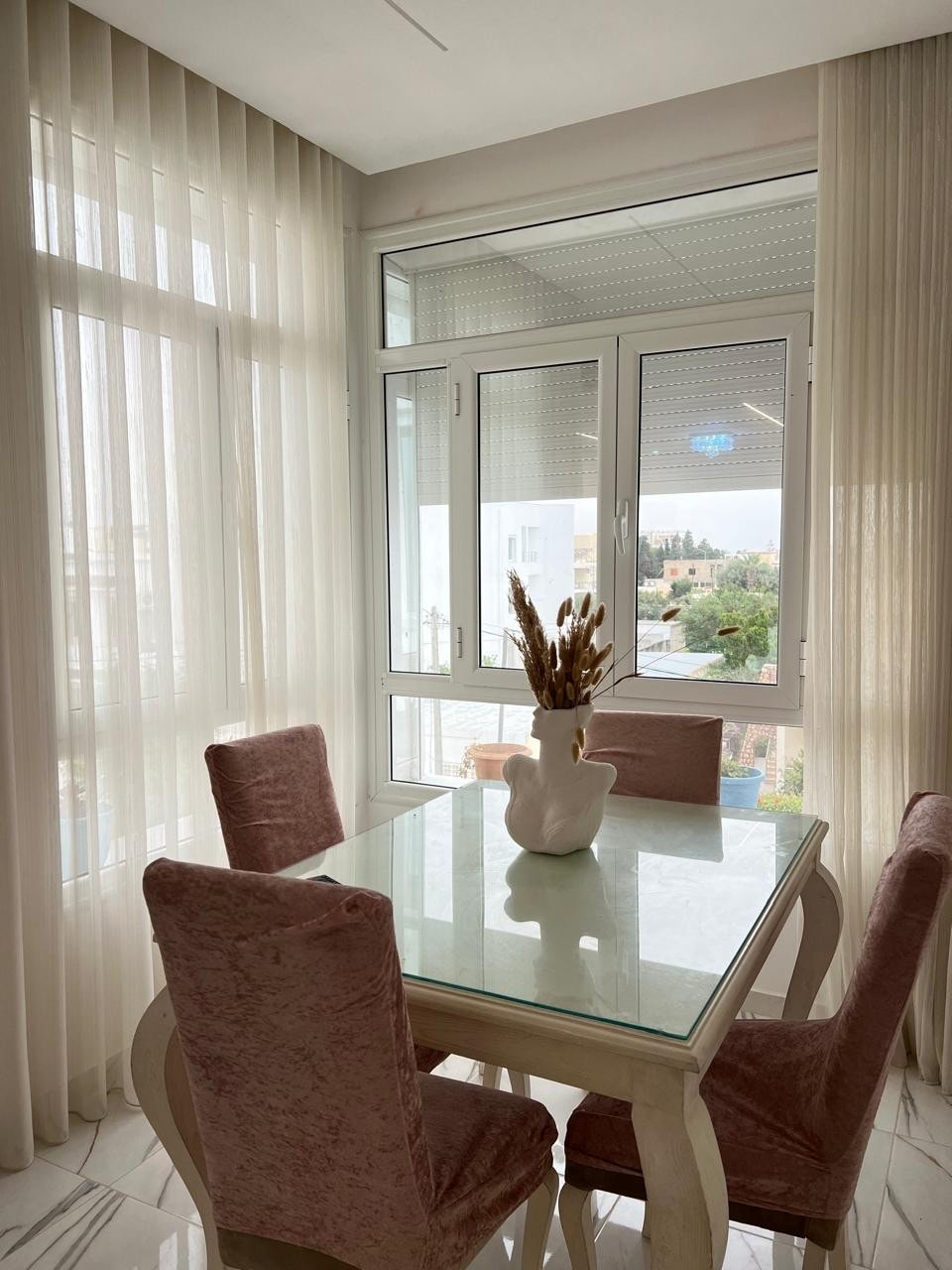 High-end design apartment of 120 m² (70 m² interior and 50 m² terrace), fully equipped and ideally located in a quiet neighborhood of Monastir. The terrace, furnished with garden furniture, a parasol, and exotic plants, is perfect for relaxation. This spacious, modern, and bright apartment is ideal for comfortable stays, whether as a couple or with friends. Close to amenities and beaches, it provides a unique setting to explore Monastir.