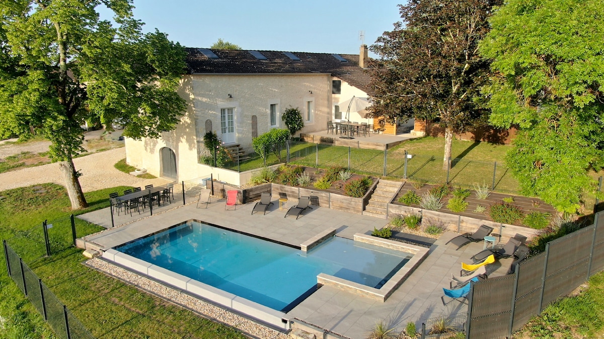 🌾Un cocon de tranquillité, au cœur de la campagne🌾 Ce gîte de 320 m² a été pensé pour conjuguer confort, espace et convivialité. Il comprend 4 suites parentales, une chambre dortoir, un salon lumineux, une grande salle à manger et une cuisine équipée. Piscine intérieure, jacuzzi avec vue, billard, boulodrome : tout est réuni pour se détendre et partager de bons moments. Idéal pour les séjours en famille, entre amis, ou pour accueillir séminaires et retraites dans un cadre paisible.